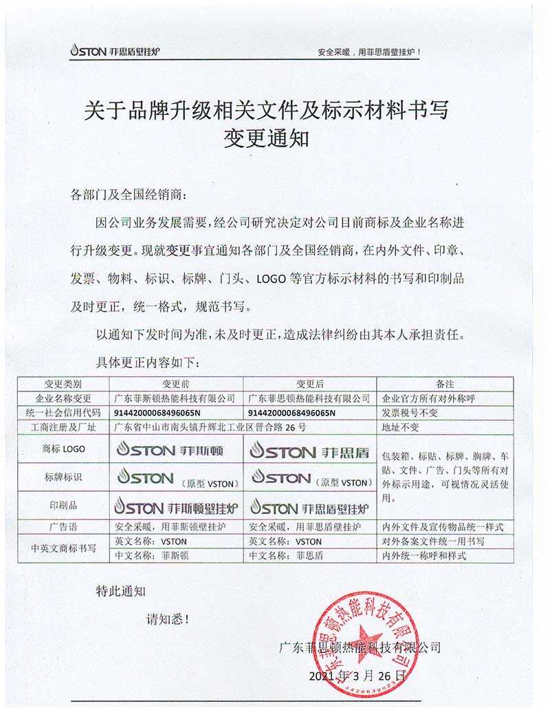 因公司業(yè)務(wù)發(fā)展需要,經(jīng)公司研究決定對(duì)公司目前商標(biāo)及企業(yè)名稱進(jìn)行升級(jí)變更。現(xiàn)就變革事宜通知各部門及全國(guó)經(jīng)銷商,在內(nèi)外文件、印章、發(fā)票、物料、標(biāo)識(shí)、標(biāo)牌、門頭、LOGO等官方標(biāo)示材料的書寫和印制品及時(shí)更正,統(tǒng)一格式,規(guī)范書寫。