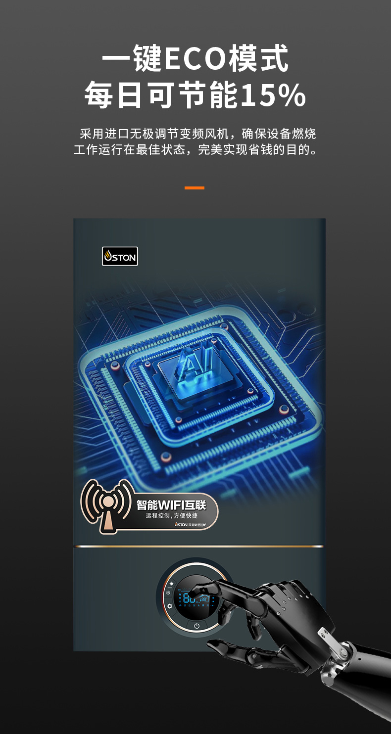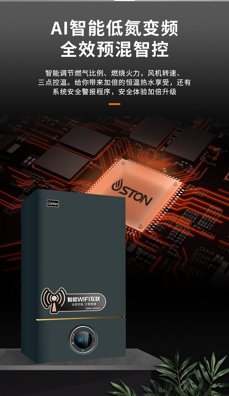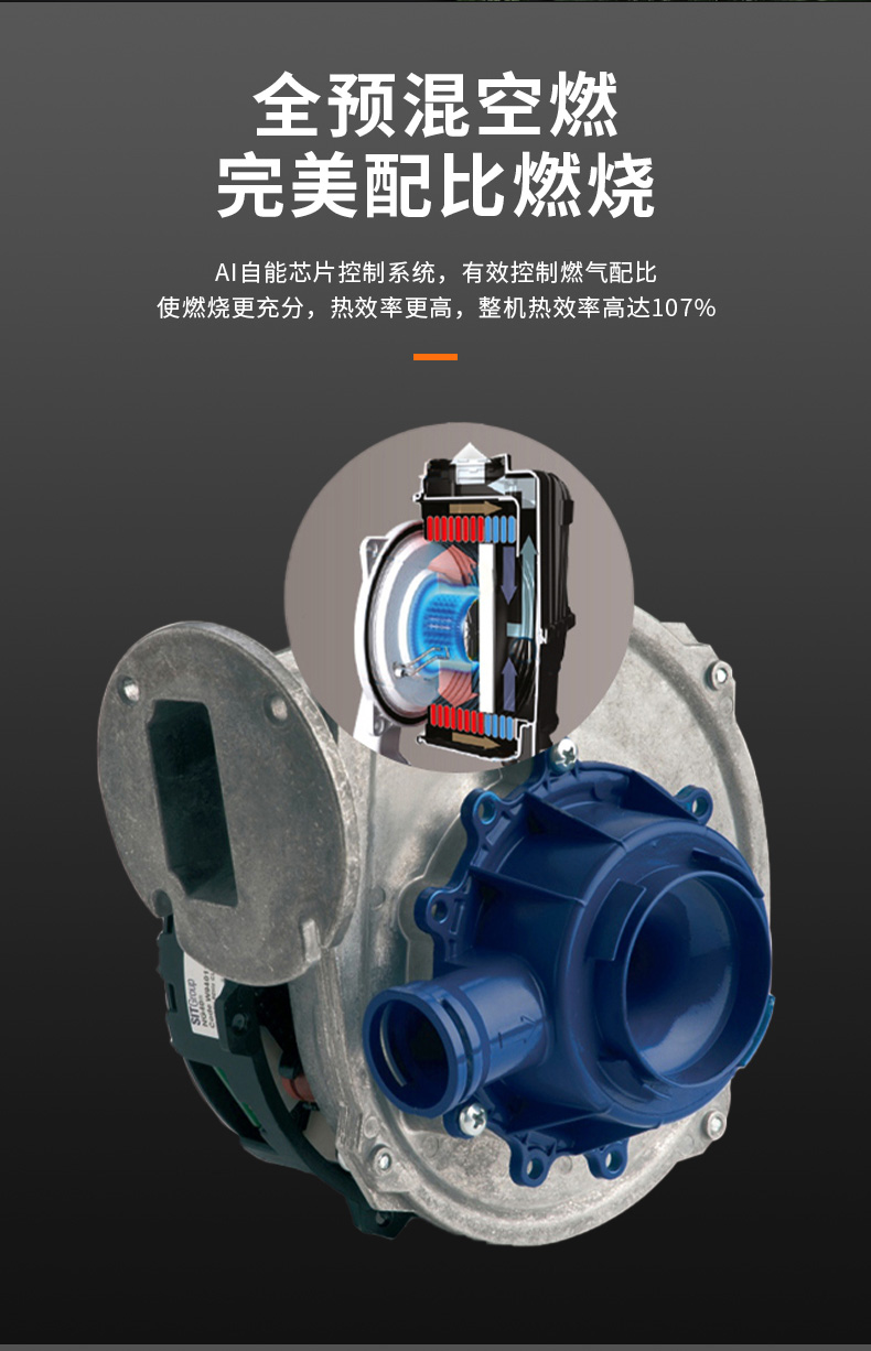 AI智能芯片集成變頻控制燃氣預(yù)混系統(tǒng)、燃燒系統(tǒng)、冷凝系統(tǒng)、燃氣配比,使燃燒更充分。
